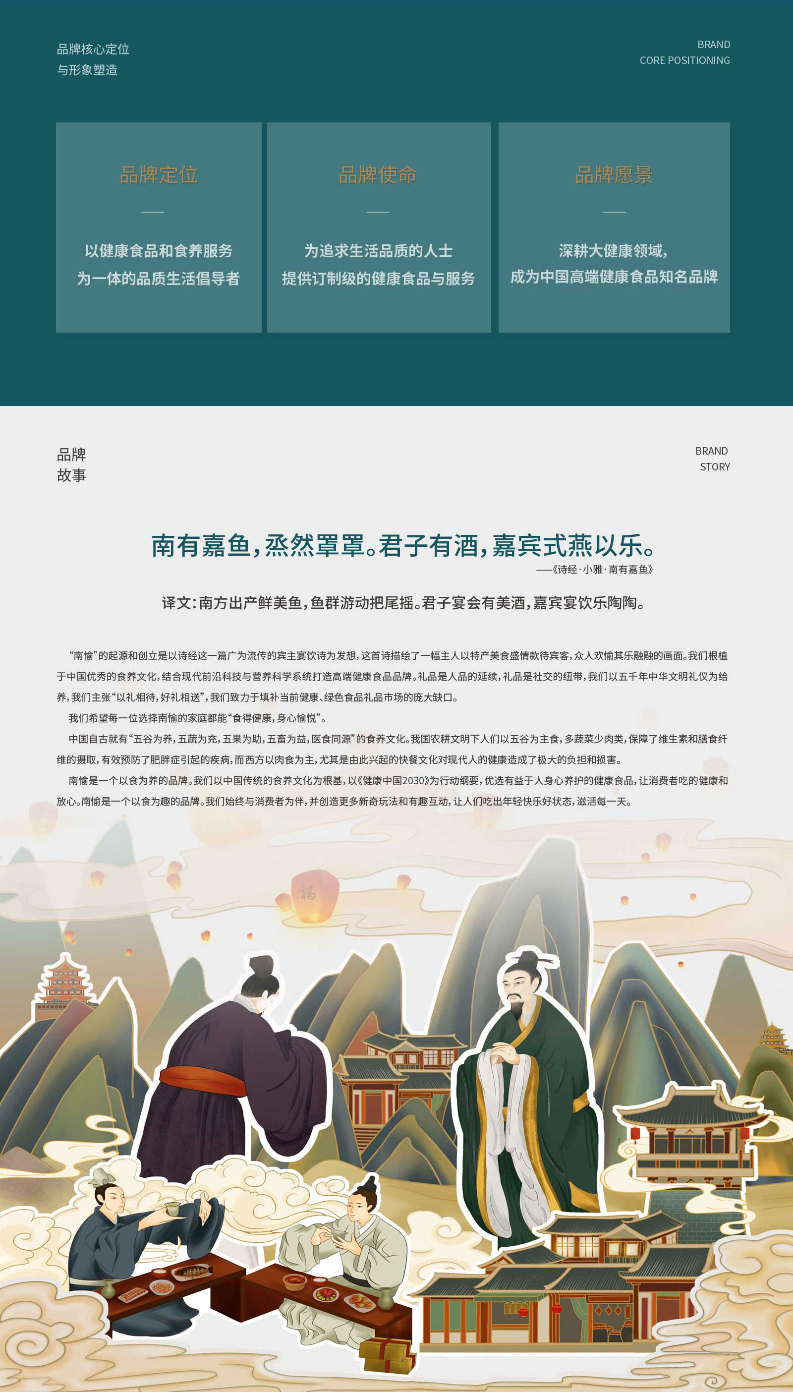石特將南愉定位為“以健康食品和食養(yǎng)服務(wù)為一體的品質(zhì)生活倡導(dǎo)者”的品牌,將“食在健康,時(shí)有南愉。”作為南愉品牌的SLOGAN,利用簡(jiǎn)短有力的文字傳達(dá)南愉品牌調(diào)性。在logo設(shè)計(jì)上,將品牌名和“中國(guó)結(jié)、中式鏤空花窗及樹(shù)葉”這些極具代表中國(guó)的古典元素巧妙結(jié)合,利用中式古典的風(fēng)格進(jìn)行視覺(jué)呈現(xiàn)。在包裝設(shè)計(jì)上,注入”仁、禮、義、勇、敬”的中國(guó)傳統(tǒng)文化,結(jié)合產(chǎn)品特性,尋找到高度的契合點(diǎn),以原創(chuàng)手繪插畫(huà)的創(chuàng)意表現(xiàn)形式,將文字、畫(huà)面、故事等融入產(chǎn)品包裝設(shè)計(jì)中,充分為南愉賦予豐富的文化內(nèi)涵。無(wú)論是從策劃還是到視覺(jué)呈現(xiàn)效果上,我們注重突顯出南愉的文化內(nèi)涵與品牌價(jià)值,進(jìn)而提升品牌的附加值。