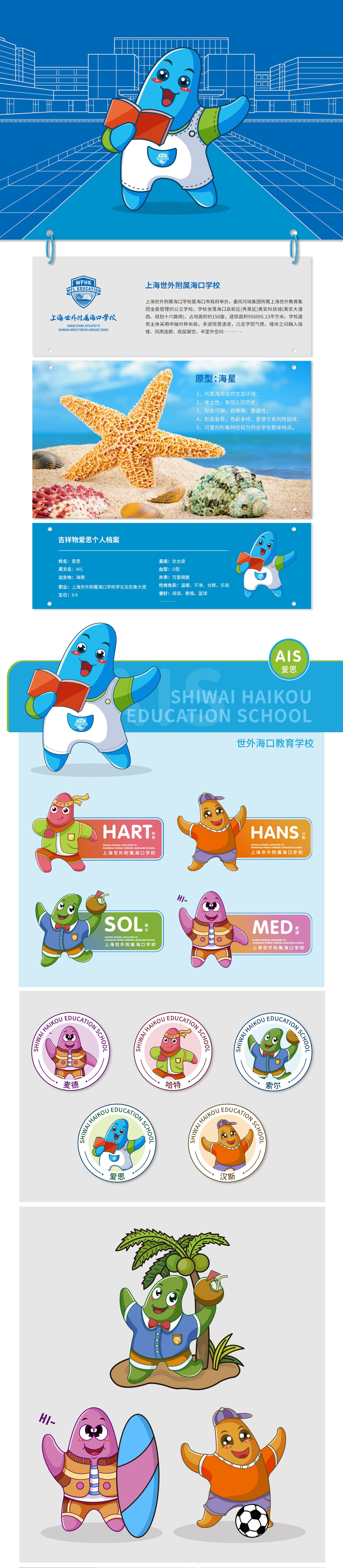 考慮到這所學校位處海口,地理位置優越,環境優美,景色宜人,同時作為學校及學生的宣傳大使,需要具備辨識度高、記憶點強的特點。基于此,石特在對吉祥物進行設計創作時,選取以海星為原型,其不僅能代表海南自然的生態環境,還具有本土性強,歷史悠久的特性;通過對學生群體性格特征及愛好的分析,擬化出自帶萌性的卡通形象,特征明顯極易辨認;吉祥物以系列化的形式進行呈現,整體顏色明亮活潑,其中有熱愛唱歌的“麥穗”,認真學習的“哈特”,樂觀向上的“索爾”,喜歡閱讀的“愛思”以及愛足球運動“漢斯”,它們形態可掬,萌感十足,符合學生群體的特點。本次石特為上海世外附屬海口學校的吉祥物的成功策劃,得到了客戶的高度認可。