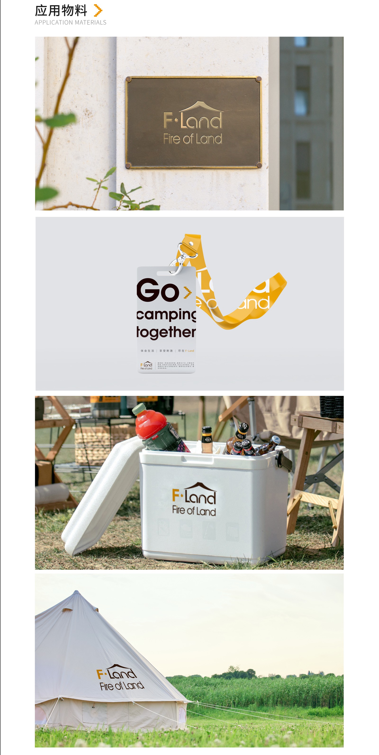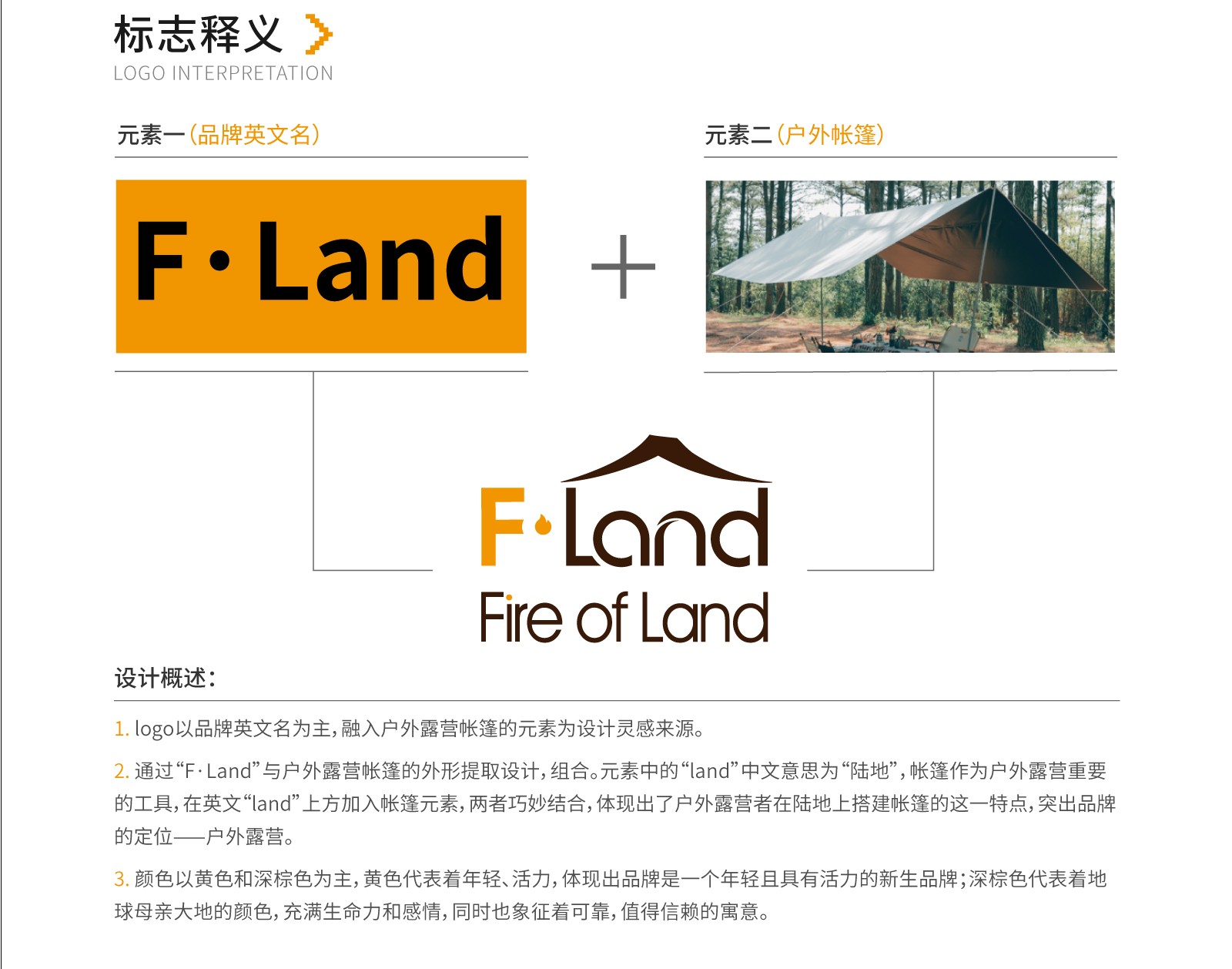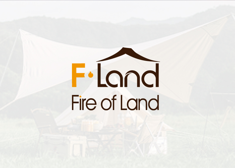 通過“F.Land"與戶外露營帳篷的外形提取設(shè)計,組合。元素中的“l(fā)and"中文意思為“陸地”,帳篷作為戶外露營重要的工具,在英文“l(fā)and"上方加入帳篷元素,兩者巧妙結(jié)合,體現(xiàn)出了戶外露營者在陸地上搭建帳篷的這一特點,突出品牌的定位一戶外露營。