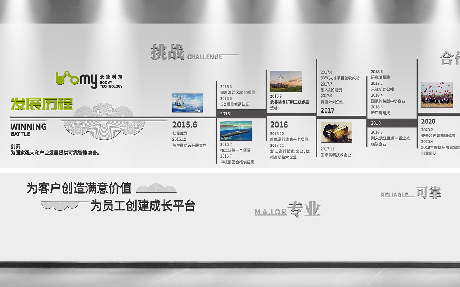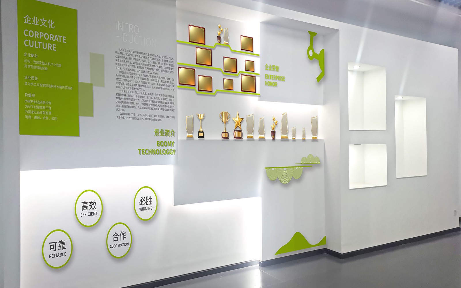 景業只能科技文化墻與榮譽墻的設計經過石特廣告的策劃,讓原本光禿禿的墻壁有了展示公司實力的窗口
