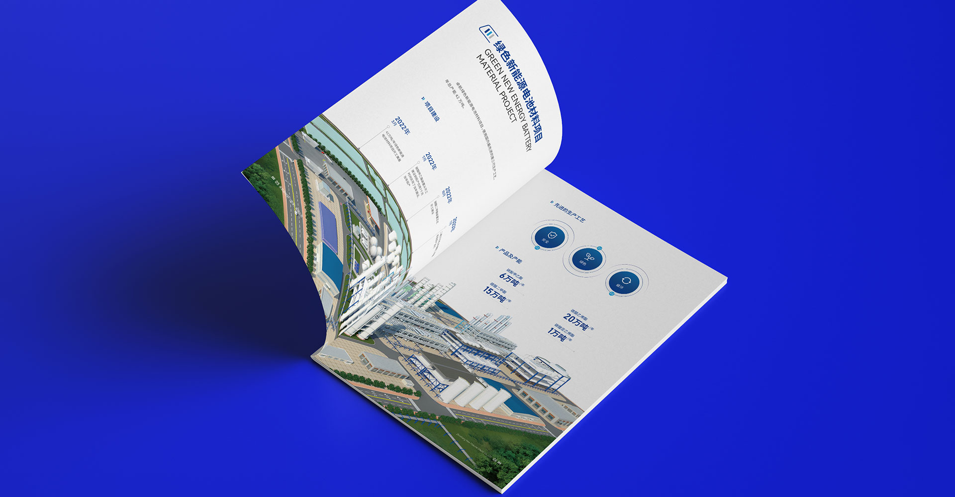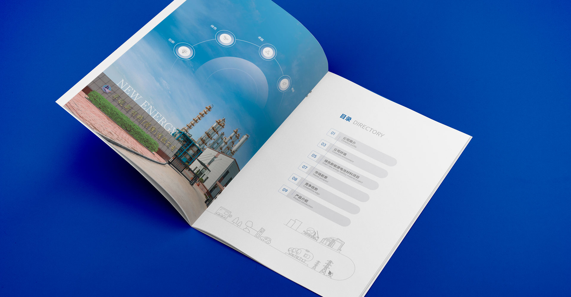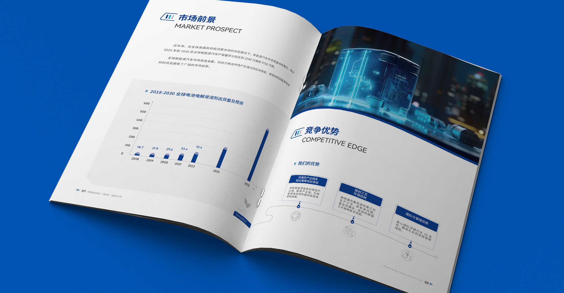 我們將宣傳冊分為公司簡介、公司環境、綠色新能源電池材料項目、市場前景、競爭優勢以及產品介紹等六個板塊。公司簡介及環境讓受眾對企業有一個基本的認識,重點介紹綠色新能源電池材料項目,并對市場前景、競爭優勢進行分析,幫助受眾梳理企業強勢之處,以體現卓航新材料的專業性和領先性,展示產品時圖文結合,配合圖表,信息分明。