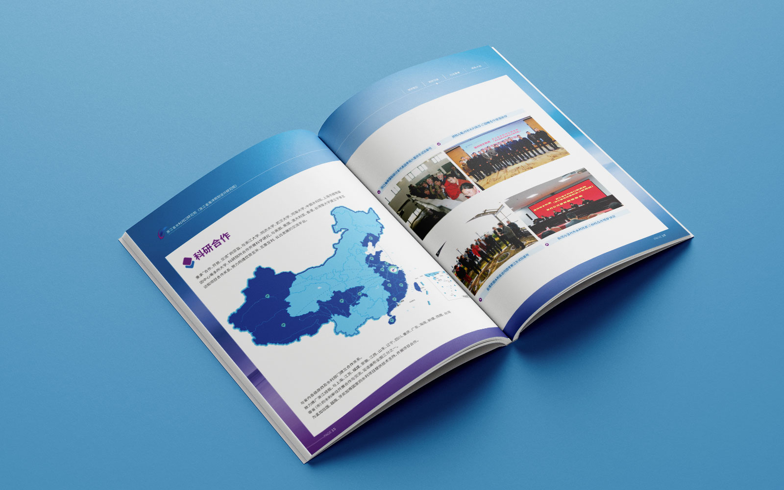 2、石特設計宣傳冊內頁時,采用了簡潔明了、圖文并茂的方式來展示研究院的發展歷程、業務領域、科研合作等相關信息,其中大量使用圖片、數據來呈現相關信息,并配以簡單易懂、通俗易懂的文字說明,便于用戶理解。
