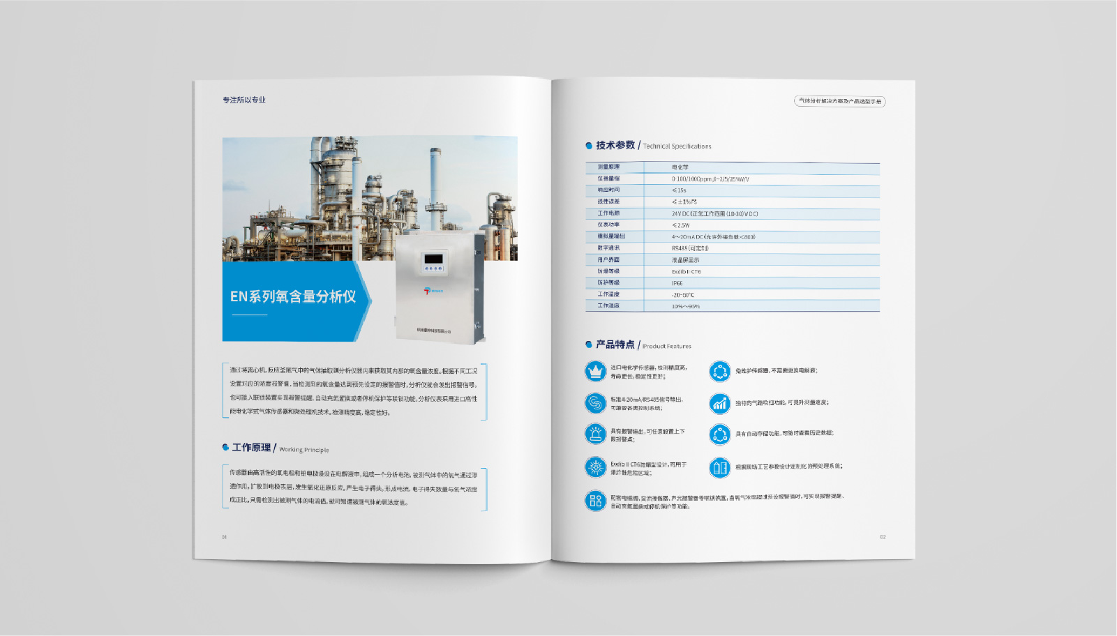 3、內頁將產品詳細展示,并針對每個產品進行細致介紹。同時,在每個產品介紹中加入工作原理、技術參數、產品特點等信息,讓客戶更全面地了解泰仲科技所提供的氣體分析解決方案及產品。