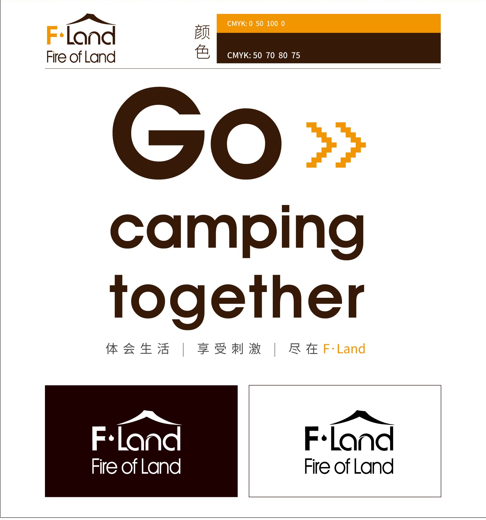 通過(guò)“F.Land"與戶外露營(yíng)帳篷的外形提取設(shè)計(jì),組合。元素中的“l(fā)and"中文意思為“陸地”,帳篷作為戶外露營(yíng)重要的工具,在英文“l(fā)and"上方加入帳篷元素,兩者巧妙結(jié)合,體現(xiàn)出了戶外露營(yíng)者在陸地上搭建帳篷的這一特點(diǎn),突出品牌的定位一戶外露營(yíng)。