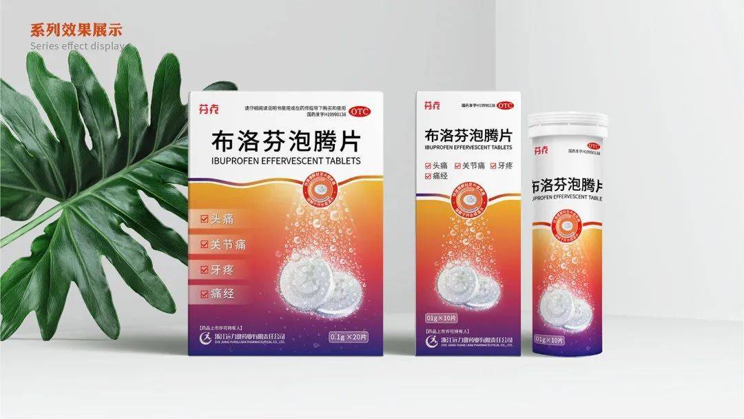 上下兩個部分以視覺黃金比例劃分區域,上半部分以白底為主,凸顯產品通用名及商品名部分;下半部分以黃紅藍的漸變色塊為主,結合產品及適應癥,將產品藥用特性及產品溶解形態展示出來。