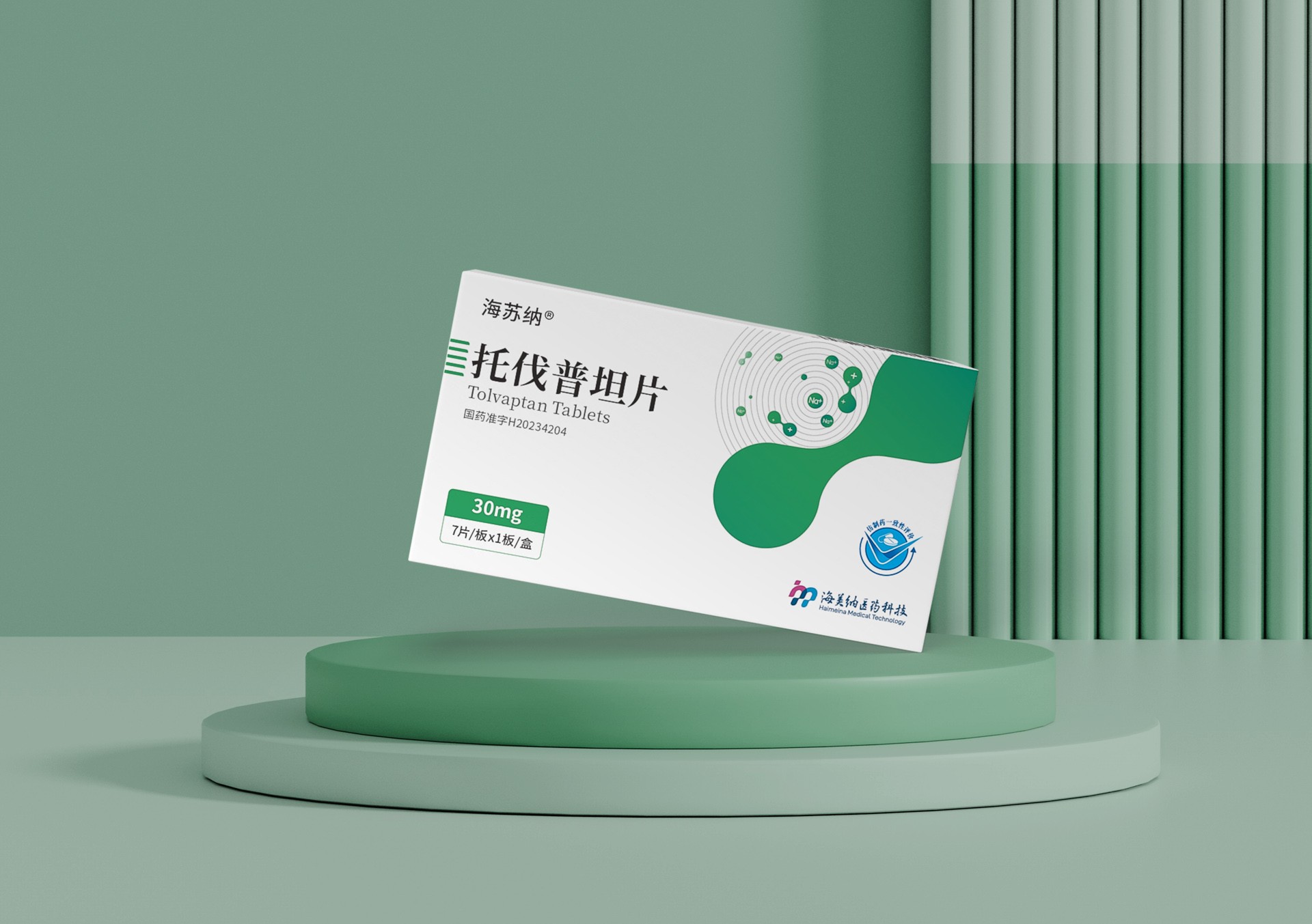 整個包裝盒以白色為主色調,展現出清新、純凈的視覺效果,符合醫療產品的專業形象。在盒子的設計上,巧妙地融入了綠色和藍色的設計元素,不僅為整體設計增添了活力,也與托伐普坦片的醫療屬性相呼應。 包裝盒的正面顯著位置印有“托伐普坦片”的中文和英文標識,字體清晰易讀,便于患者和醫護人員快速識別。同時,藥品的劑量“30mg”以及包裝規格“7片/板×1板/盒”等信息也得以明確標注,確?;颊吣軌驕蚀_了解和使用藥品。 包裝盒下方設計了一個淺綠色的圓形臺座,不僅為藥品提供了穩定的支撐,還增加了整體設計的層次感。背景墻采用淡綠色,并輔以垂直條紋裝飾,為整個包裝增添了現代感和時尚感。在包裝盒的背面或側面,應標注國藥準字、生產廠家、生產日期、有效期等詳細信息,確?;颊吣軌蛉媪私馑幤返南嚓P信息。 總的來說,托伐普坦片的藥品包裝設計既體現了醫療產品的專業性,又充分考慮了患者的使用體驗。通過簡約而不失設計感的外觀,以及清晰明了的文字信息,該藥品包裝能夠有效地幫助患者識別和使用藥品,提升了產品的整體品質和市場競爭力。