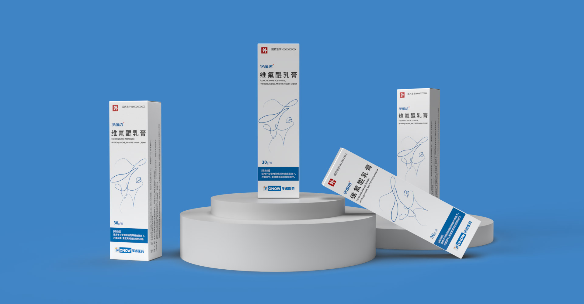 孚諾醫藥兩批次委托石特大健康進行產品包裝設計,首次設計產品上市滿意后進行了二次新款的設計;為維氟醌乳膏設計包裝:“孚康達”的首字母“F”進行創意設計,紫色、白色色塊勾勒“F”字形,增強品牌識別,紫色寓意優雅、高貴,以其為主色與產品主要治療功效變美的預期目標相符合。同款產品兩個渠道不同設計方案。