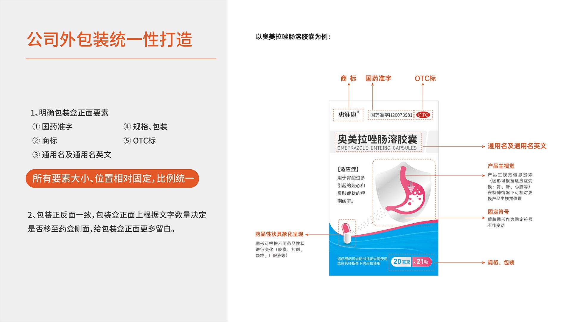 產品外包裝設計打造的方向和目標:1、增強統一性,外包裝版型統一,各要素統一,大小、比例、位置相對固定;2、提高辨識度,外包裝醒目易辨,充分體現產品家族式管理,提高不同企業之間的辨識度、公司產品之間的辨識度、同一產品不同規格之間的辨識度3、增強美觀度,版面簡潔美觀,各要素大小、比例、位置設置合理,圖形、色塊和色彩搭配協調。