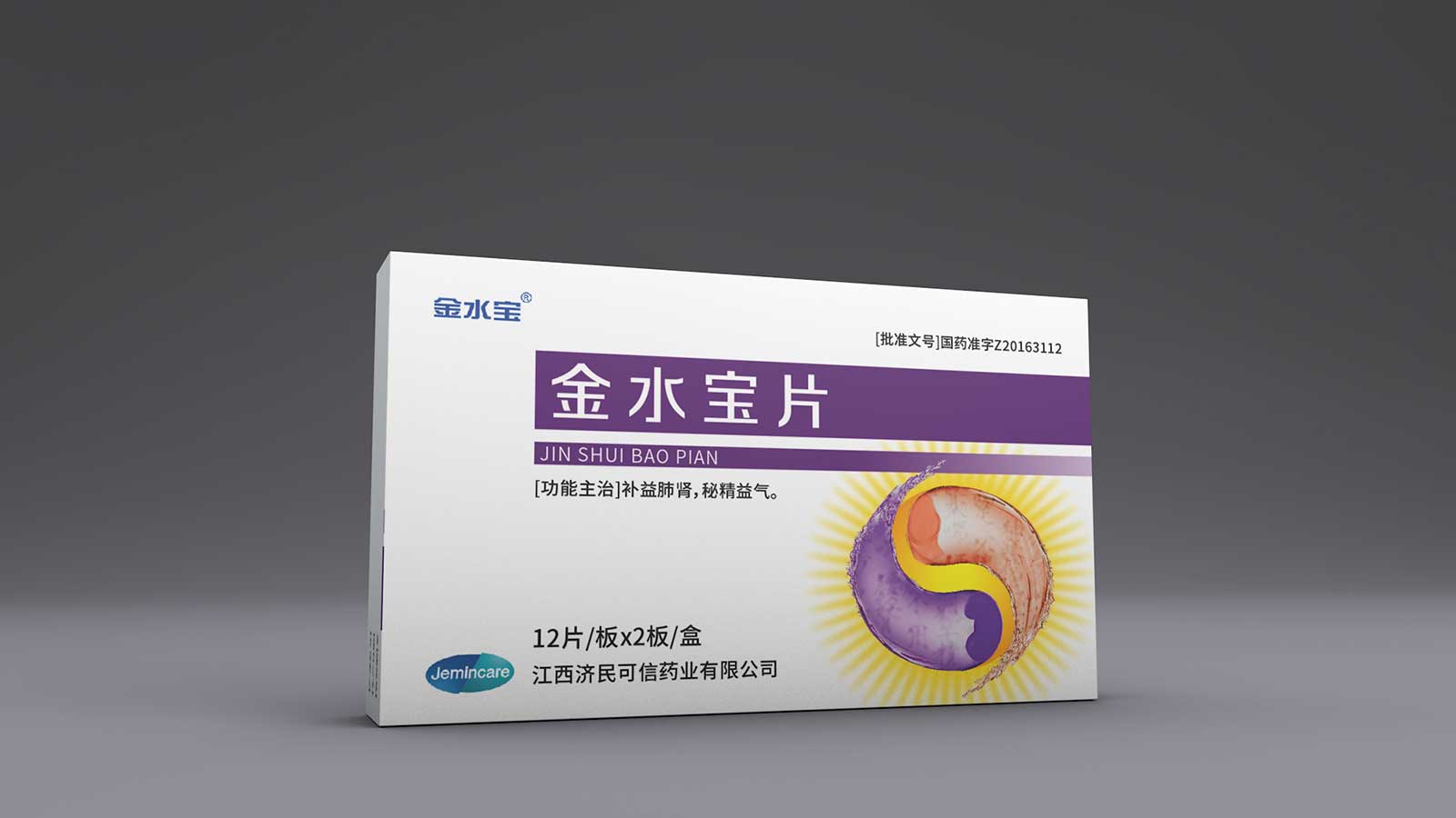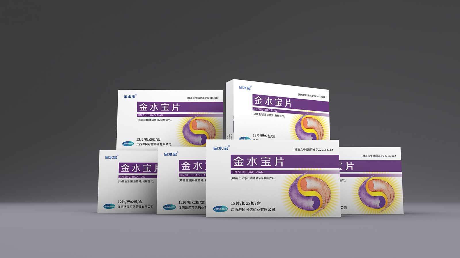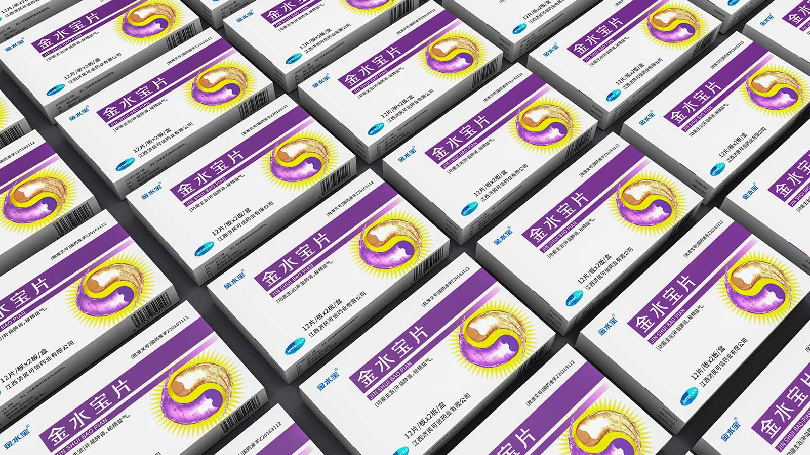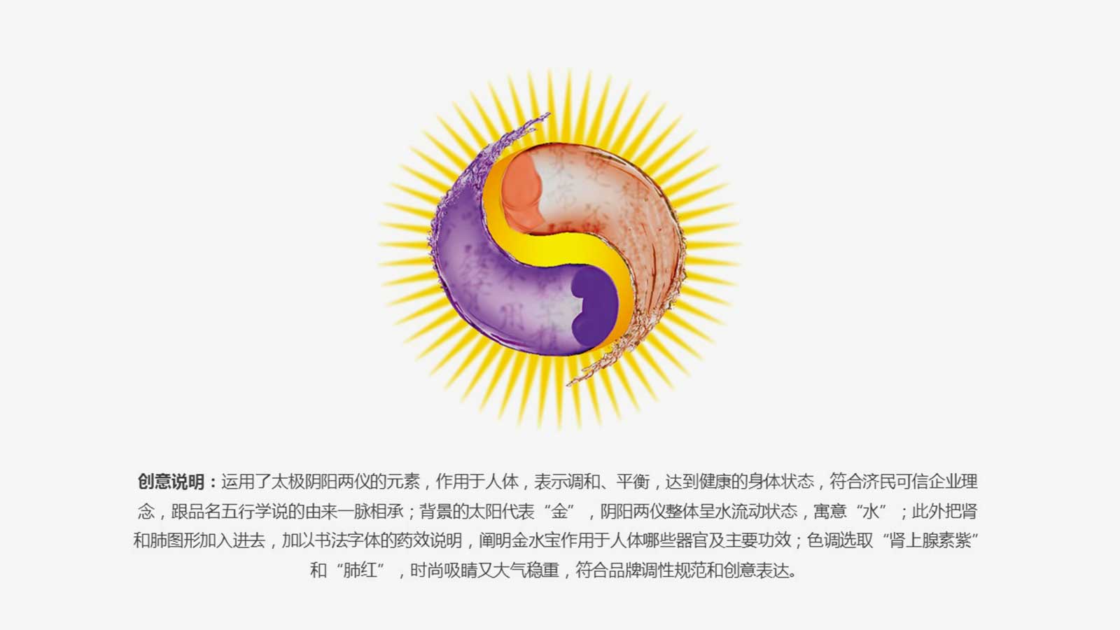 運(yùn)用了太極陰陽(yáng)兩儀的元素,作用于人體,表示調(diào)和、平衡,達(dá)到健康的身體狀態(tài),符合濟(jì)民可信企業(yè)理念,跟品名五行學(xué)說(shuō)的由來(lái)一脈相承;背景的太陽(yáng)代表“金”,陰陽(yáng)兩儀整體呈水流動(dòng)狀態(tài),寓意“水”;此外把腎和肺圖形加入進(jìn)去,加以書(shū)法字體的藥效說(shuō)明,闡明金水寶作用于人體哪些器官及主要功效;色調(diào)選取“腎上腺素紫”和“肺紅”,時(shí)尚吸睛又大氣穩(wěn)重,符合品牌調(diào)性規(guī)范和創(chuàng)意表達(dá)。