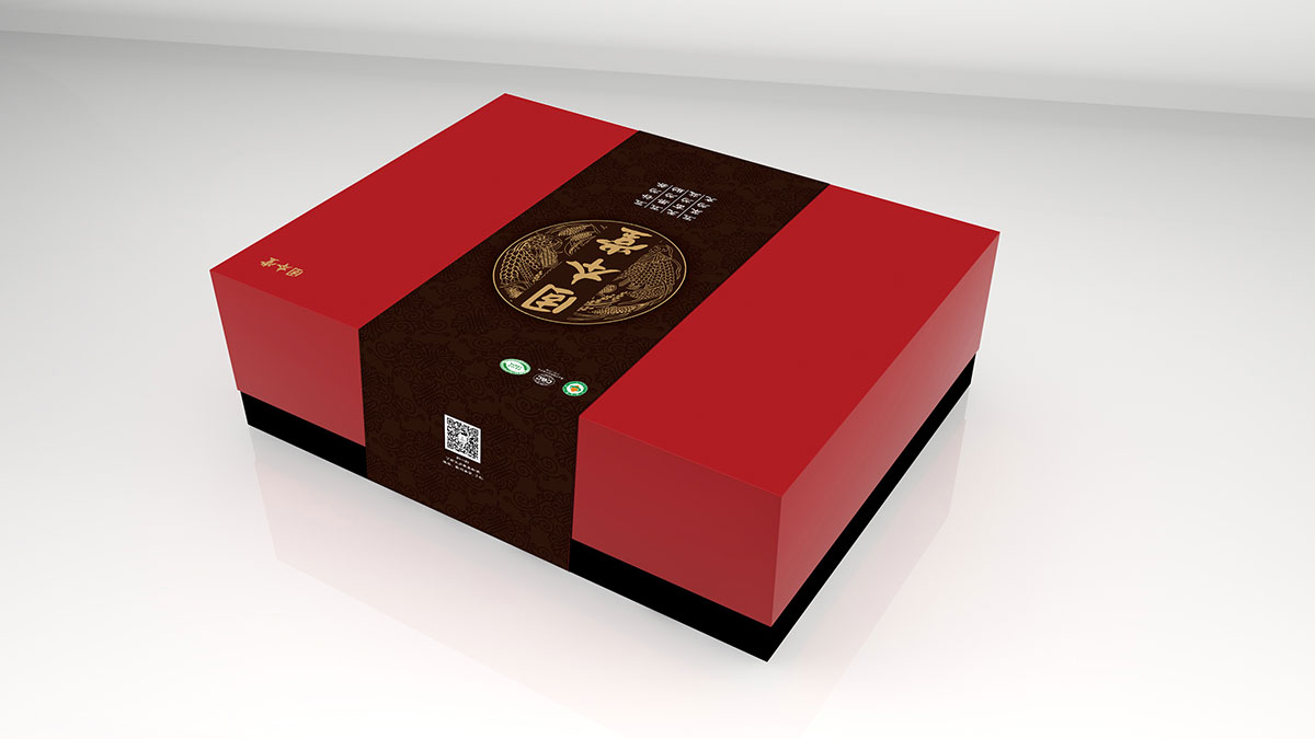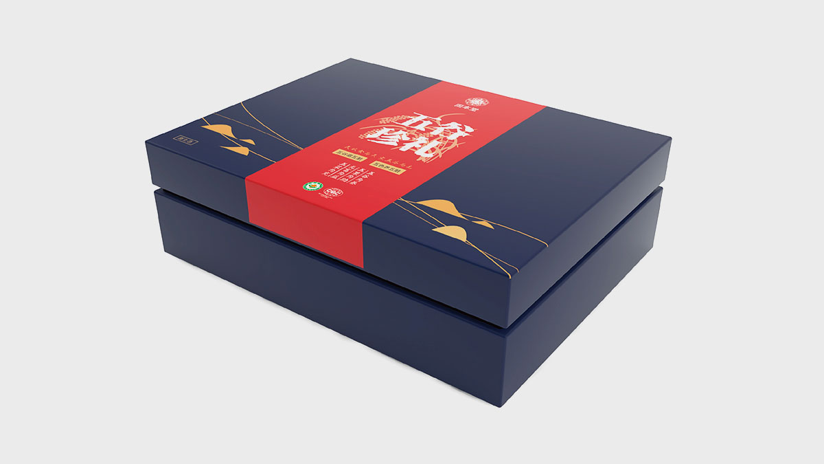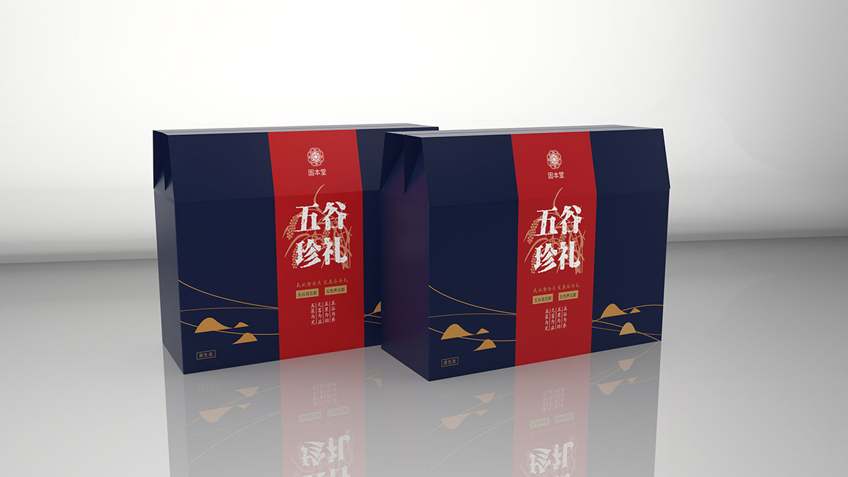 本款設計用了紅色、藍色以及燙金工藝。禮盒取了“五谷珍禮”為商品名,給人一目了然。元素上采用谷物類高梁為北景,主圖是小山和起伏的農地,體現出有機和原生態品質。