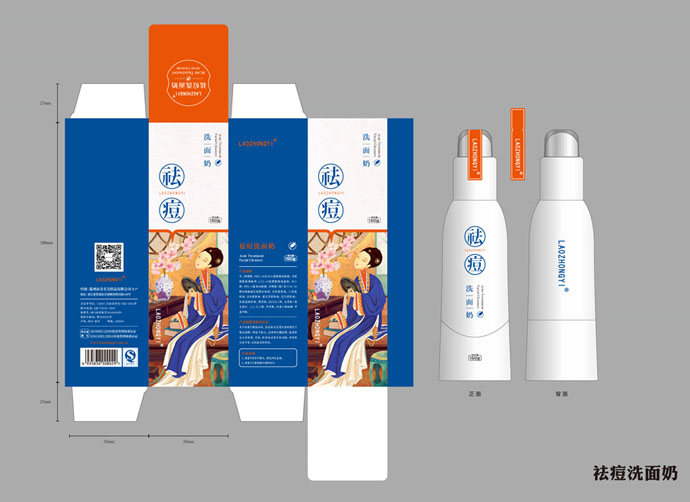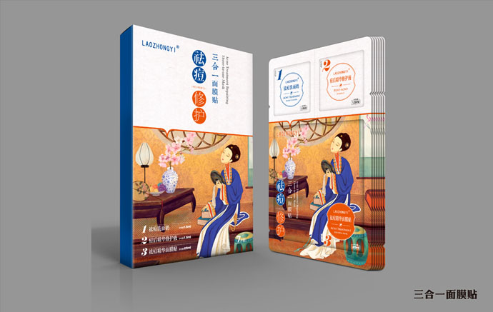 祛痘兩個字放的位置比較明顯,這樣既闡述了產品的功能又很快的吸引了顧客的眼球,旁邊加以小子輔助說明了產品的具體特性,將祛痘的功能表現了出來。愛美之心人皆有之,包裝盒上是一個古代女子坐在閨房內照鏡子,給人一種古典美。宮廷多秘方,以古代美人為畫面可以使人聯想更多。祛痘洗面奶、祛痘修護液、祛痘修護霜瓶子材料包裝設計上采用瓷感白,給人一種白凈清爽的感覺仿佛如美人的臉一樣白皙干凈,同時瓶子設計的很精致給人一種高貴典雅的美感。